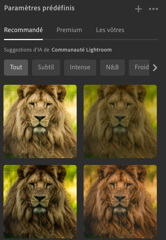 Dans les dernières versions de Lightroom, des outils d’intelligence artificielle (IA) sont intégrés pour t'aider à gagner du temps et améliorer encore plus tes résultats.