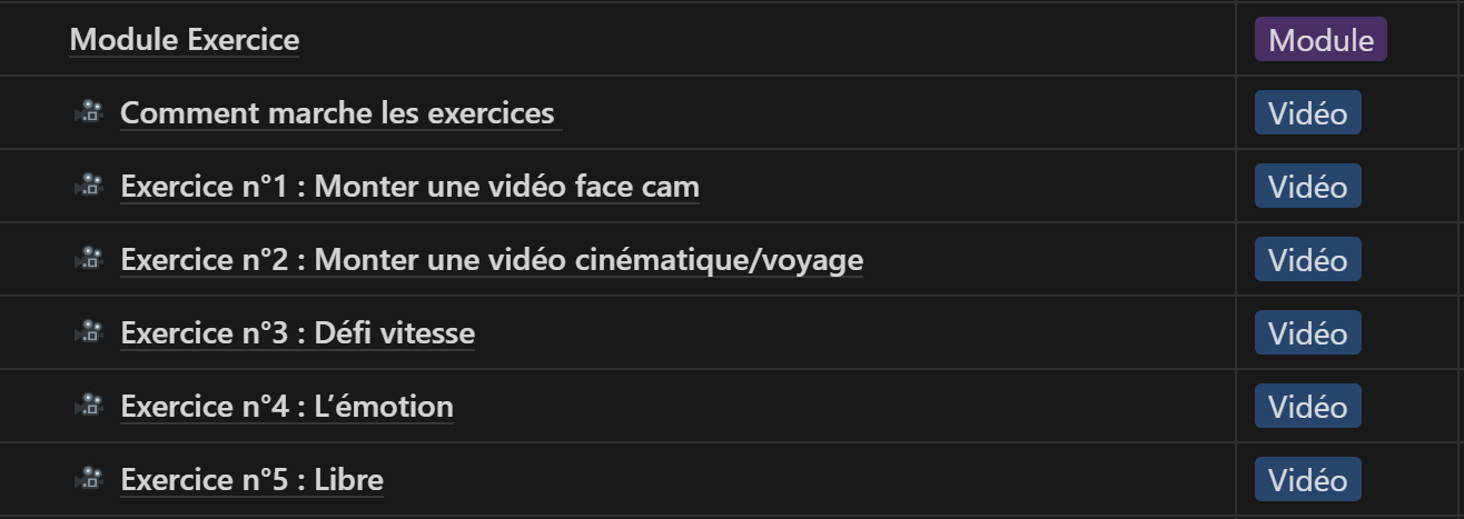 📼 Un module sur chaque grosse étape du montage vidéo (dérush, montage, effets, sous-titrages, colorimétrie, sound-design & musique, exportation).